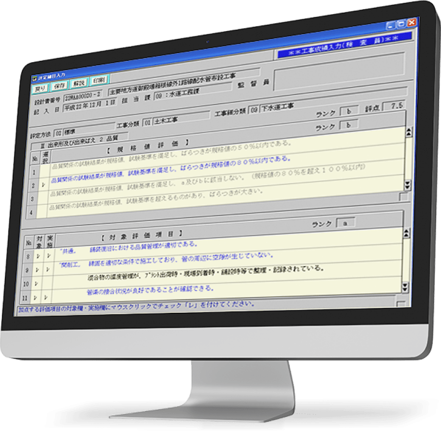 工事事務システムは、工事全般の様々な文書を作成・共有できます。また、工事成績評定機能を備え工事別に評価点が算出できます。日々の煩雑な管理業務をトータルサポートします。