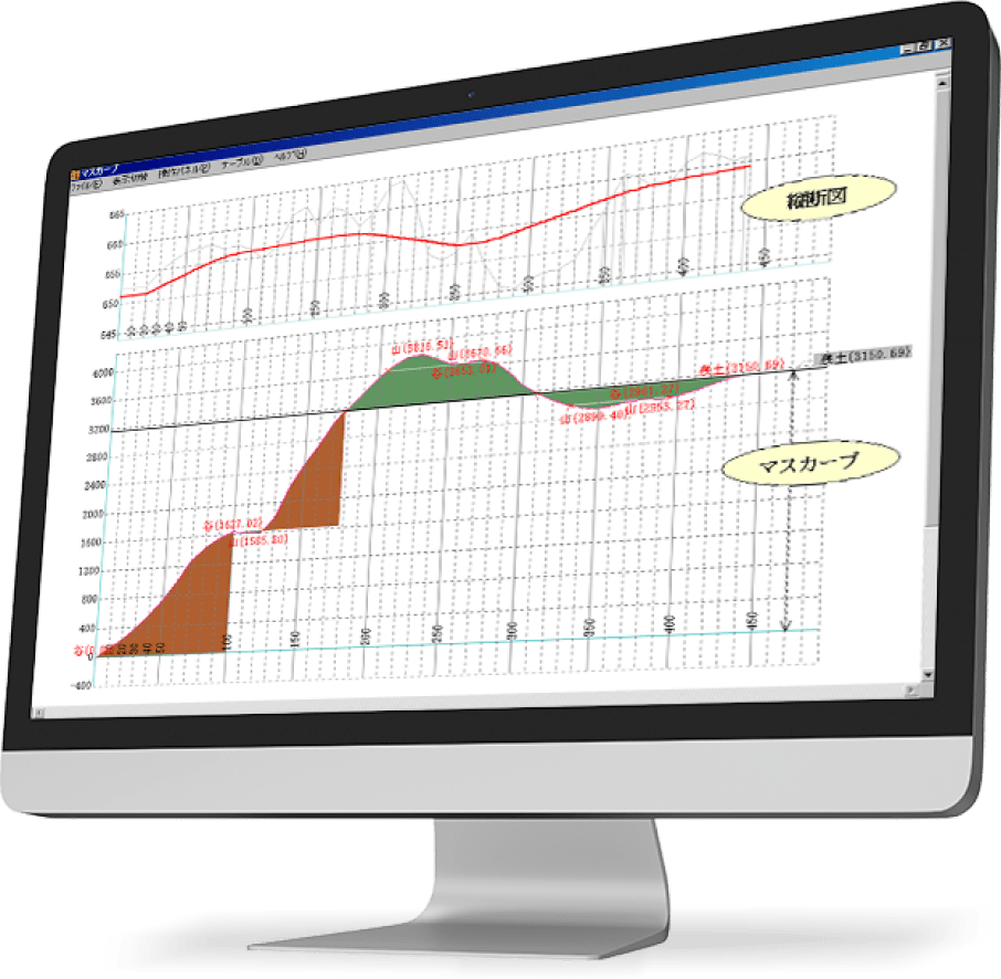 土工事で用いる土量計算を行います。マスカーブグラフ(土積曲線図)で土の運搬計画を効率よく作成でき、土工数量表まで出力できます。